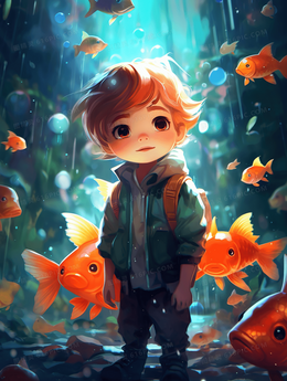 可爱卡通海底小男孩和金鱼创意插画