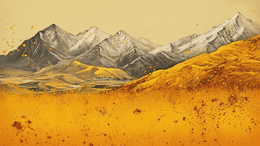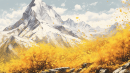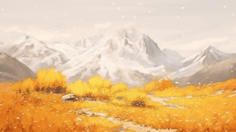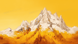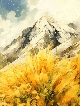 巍峨的山峰下布满了金色的植物风景插画