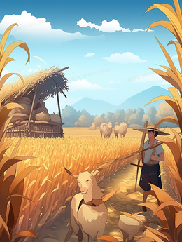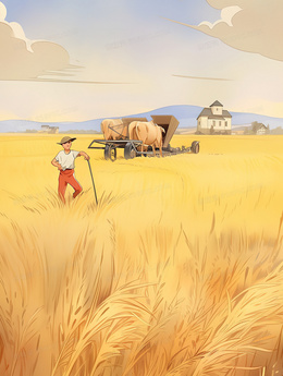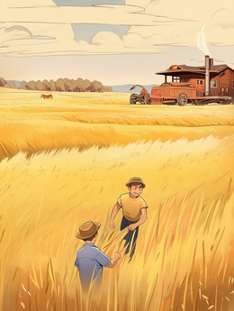 > 金色麦田拖拉机丰收插画