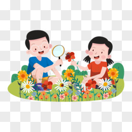 卡通手绘学生课外观察昆虫场景插画
