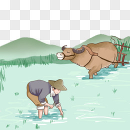 手绘卡通农民牛耕地免抠元素